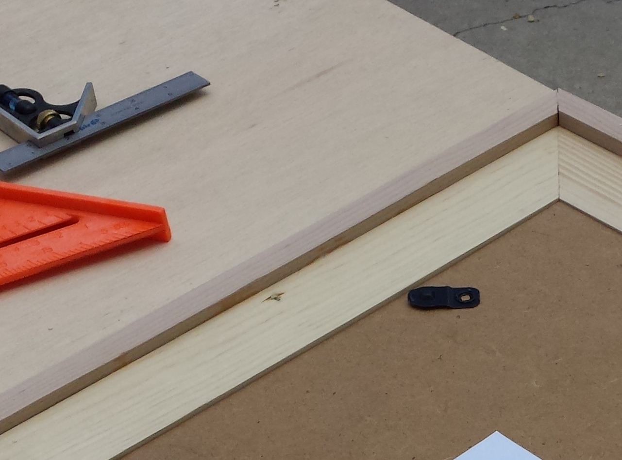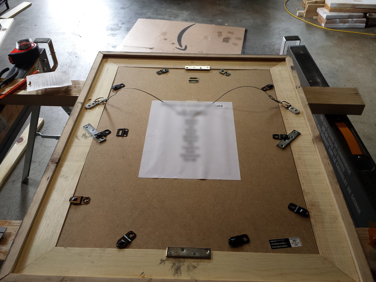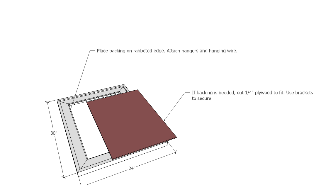 If you need a backing for the frame, measure the size you will need. Measuring to the edge of the rabbet joint, I had a bit more (1/8”) than 18”x24”. Using a table saw or circular saw with an edge guide, cut your backing. Add 1-2 brackets to secure the backing to the frame. Attach mounting hangers and hanging wire if desired.