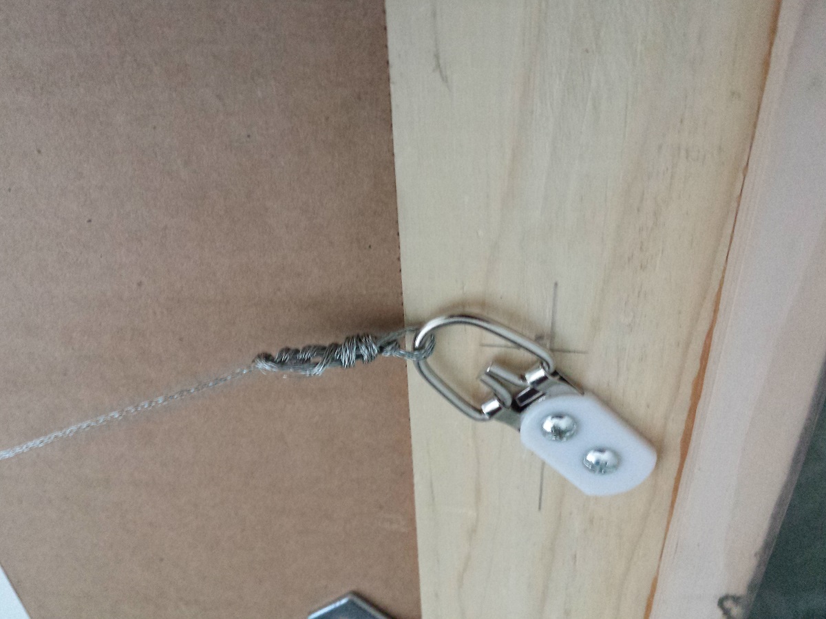 Following the instructions on the hanging wire, I made sure to leave enough slack and attached it to the mounting hangers as directed. And then because I was scared to death that this thing would release in the middle of the night and crash down on my head when I’m sound asleep, I taped it with electrical wire as an additional precaution.