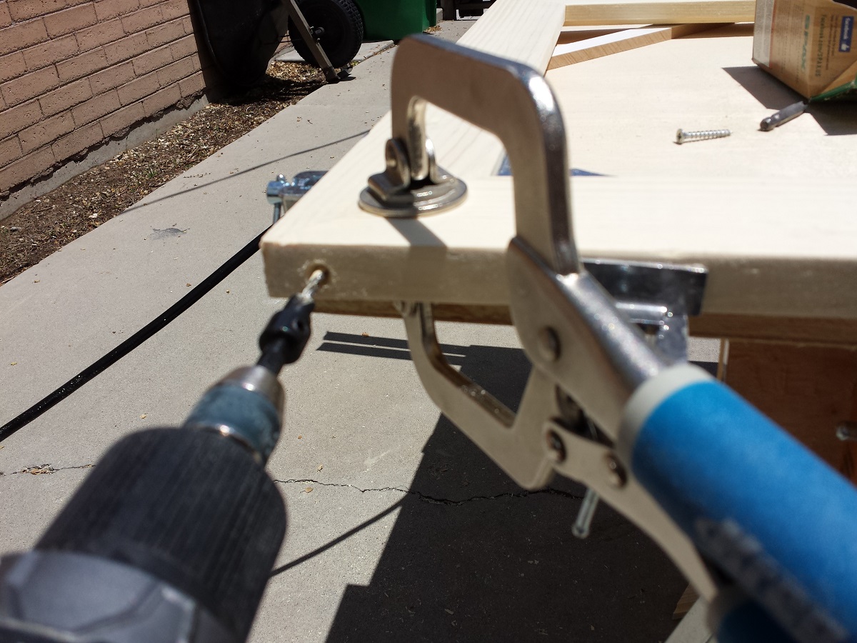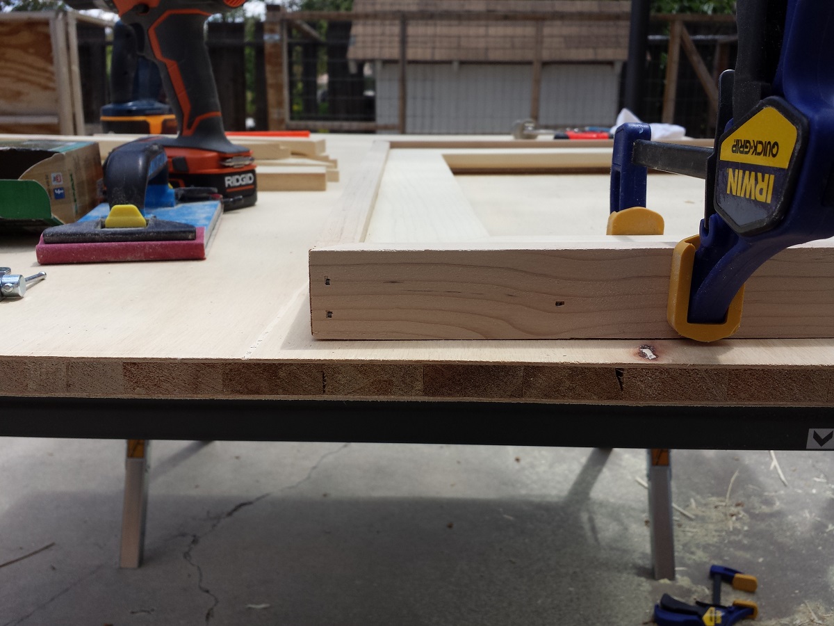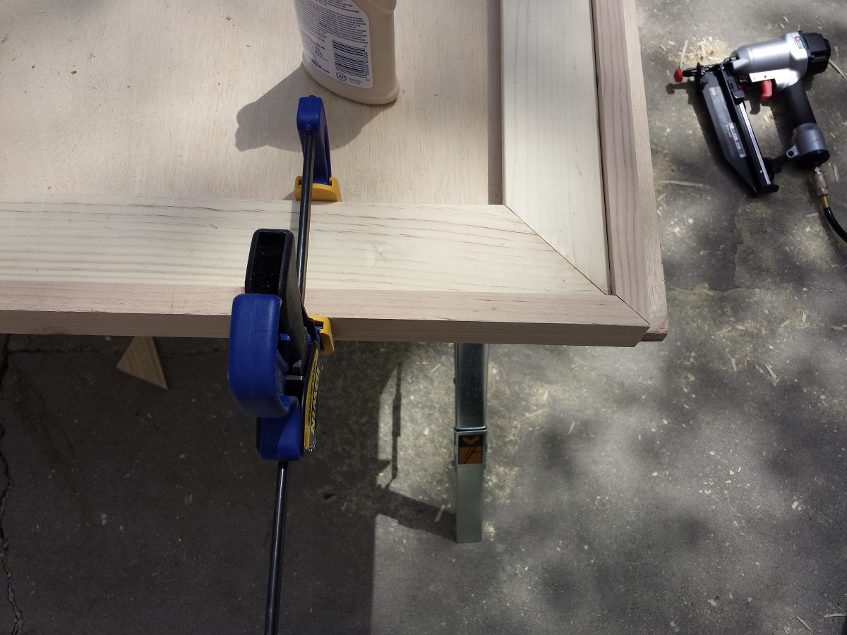 I put some wood glue on each miter and originally I tried just using 2″ finish nails from the top and side, but the frame still seemed fairly flimsy. I decided to add a 2″ screw from one side to pull everything together. I used a counter sink bit to pre-drill to prevent splitting and keep the screw head flush. I then used 2 nails on each side as well. The frame was extremely strong at this point. You’ll also notice I used a square clamp. This was the first time I ever used one of these, and I’m glad I did. You can find them at Home Depot and Lowe’s for around $10 each. I only needed 1 clamp for the project.