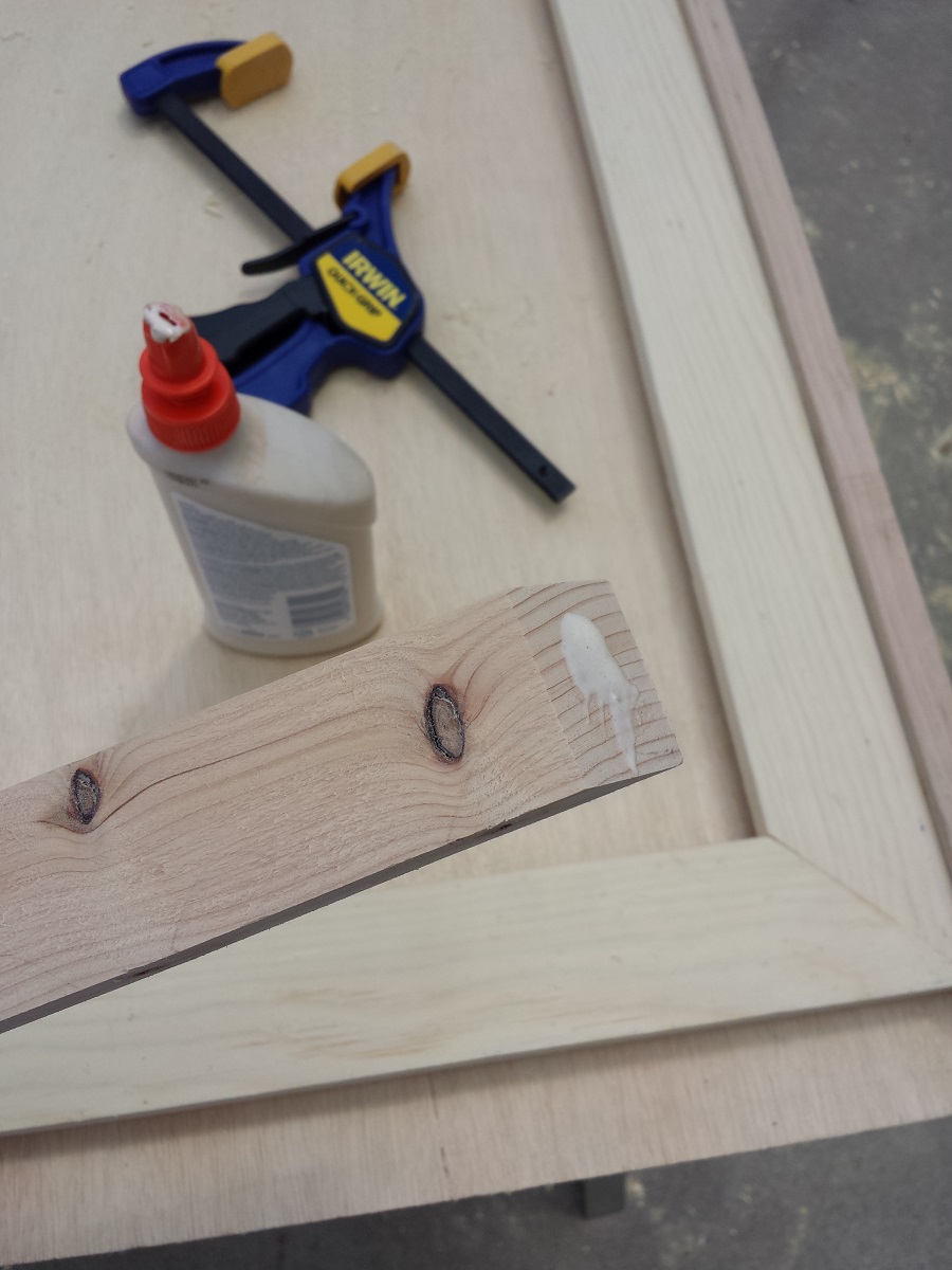 I used some scrap trim the happened to be 3/8″ thick. This acted as the perfect spacer. I put a spacer underneath each side of the frame and glued the frame edge I was working on. Then I glued the miters of the trim and clamped the trim to the frame.