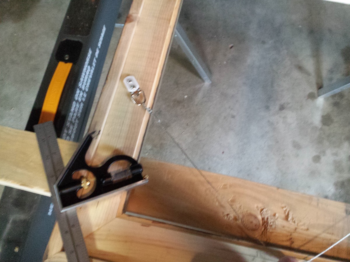 This project was full of firsts. First time using a router, first time using square clamps and the first time using hanging wire. I measured 1 1/4″ (half of the board) and used my combination square to scribe a line down the side of the frame. I also marked a “t” about 6 inches down to ensure the brackets would be attached straight across from each other.