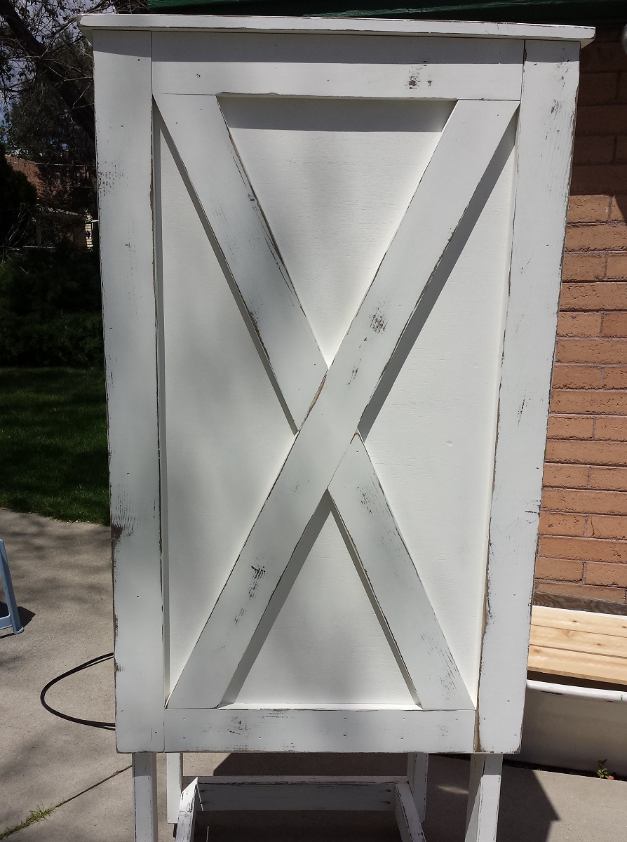 plansI came back inside with my measurements and my idea for wheels, and started drawing up some plans and calculated the costs- which at approximately $80, was much less than I was initially thinking. The next day I hit up Home Depot, and while the wife and kids were away, I started to play. I built the frame in a couple of hours, added the plywood and trim, sanded, stained, painted, antiqued and added some spar urethane over the weekend. This wasn’t really a terribly time consuming project. By the time I was done, this is what I had built. The best part? I used almost every power tool I had, even ripping a scrap 1×6 down to a 1×4 with my circular saw as I miscalculated the amount of 1x4s I needed and was too lazy to go get one. I’ll have the plans for this coming soon.