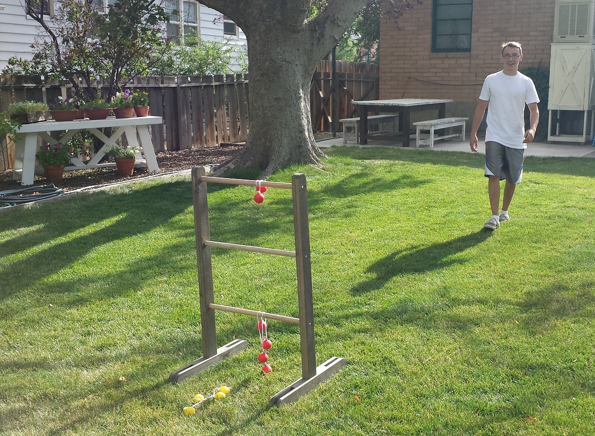 My son has been asking me to build a ladder golf set for a while. I looked around and found some cheap ones at about $20, but they seemed just that, cheap. I decided to look at some higher quality, wooden sets, but found the price around the $100+ dollar range. Yeah, not happening. So what is a person who’s hobby is building furniture out of wood to do? Yup, build it. I looked around online for some inspiration, and got a general sense of direction. I put pen to paper for a bit, came up with a few ideas, brought out the laptop, fired up sketch-up and created a 3-D model to make sure I truly liked what I had in mind. I did, and the next stop was the local lumber store. I was able to get this done in a few hours, and then had my son come out and put a beating on me.