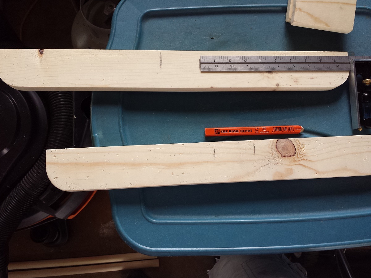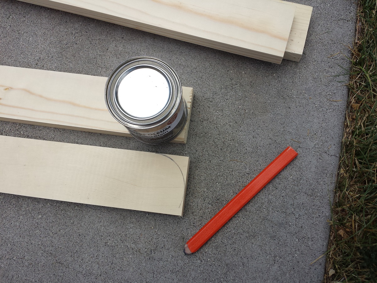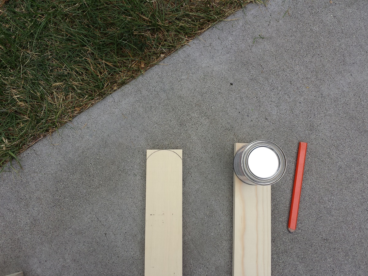 Using a small can of stain as a template, I traced a quarter circle on each edge of my legs, and a half circle at the top of my ladder sides (the notched side of the board is the bottom. Do not round these out). Using a jig-saw I cut the edges and then sanded them down to smooth them out.